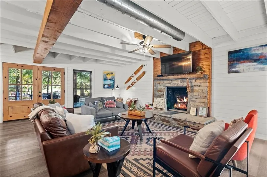 Welcome to "Oak & Pine" is a short-term rental with a welcoming lake house vibe, perfectly located in the heart of Hochatown, Oklahoma. This 3BR/2BA cabin sleeps 10 and combines charm, comfort, and convenience. Walk to restaurants, wineries, and breweries, or take a short drive to Cedar Creek Golf Course, Broken Bow Lake, Beavers Bend State Park & Marina, hiking, fishing, and all local attractions-including Choctaw Resort Casino. Recently renovated, Oak & Pine blends rustic style with modern upgrades. Enter through mahogany double French doors into the open living, dining, and kitchen area, anchored by a custom stone gas fireplace. The downstairs primary suite includes an en suite bath, with a separate laundry room nearby. Just outside, a flagstone patio features a hot tub, ideal for unwinding after a day of adventure. The kitchen offers an island and dining space, designed for gathering with family and friends. Upstairs, you'll find a guest room, a second full bath, and another bedroom with its own entertainment system and second living area. French doors lead to a private upper deck, strung with lights and tucked among the trees for a cozy treehouse feel. Outdoor spaces are made for entertaining with a covered patio and grill, perfect for cookouts, followed by evenings around the fire pit sharing stories under the stars. Fresh, bright, and inviting throughout, Oak & Pine is a true turnkey rental or personal getaway in one of Southeast Oklahoma's most desirable destinations. Contact the listing agent today for details and to schedule a showing.