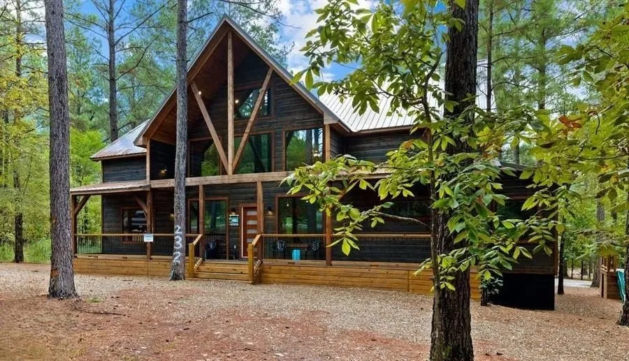 Luxury STR Cabin for Sale in Broken Bow, OK! This executive retreat is located on a large 1.6 private wooded acre lot and offers the ideal combination of luxury, space, and income potential. With 3,594 sq ft more or less, 7 bedrooms, 5 full bathrooms, and sleeping accommodations for up to 20 guests, this property is designed to impress. Step into a grand living room where vaulted ceilings, rich wood textures, and a striking floor-to-ceiling stone fireplace set the tone for a welcoming and elevated experience. Natural light fills the space, making it ideal for both quiet relaxation and lively gatherings. The open kitchen and dining area are a host’s dream—featuring granite countertops, a gas stove, stainless steel farm-style sink, expansive prep areas, and ample seating.