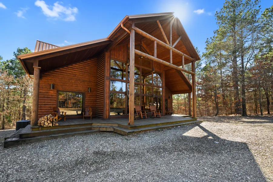 Situated on 1.25 acres Bucket List Lodge is tucked away in towering pines right in the heart of Hochatown. Four bedrooms, five bathrooms and lower and upper level entertainment spaces designed with large groups in mind feature luxury upgrades and one-of-a-kind details including carved woodland critters that add to the appeal of this impressive, furnished cabin. Massive back porch with fireplace and hot tub overlooks play fort, horseshoe pit, fire pit, and beautiful wooded surroundings. Guests just love this place!