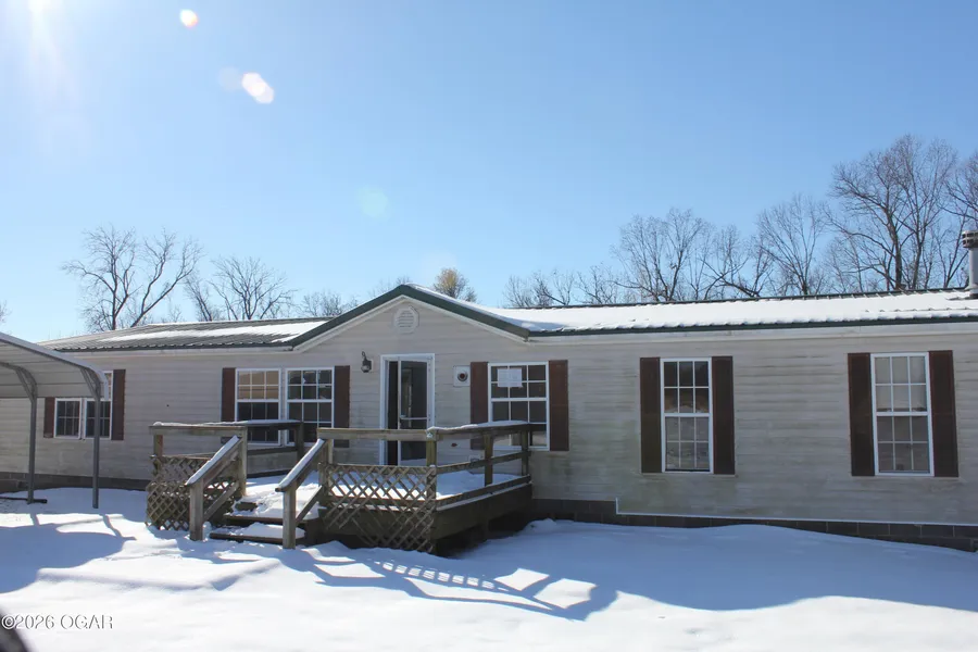 Spacious 3 bedroom 2 full bath manufactured home offering an open floor plan. Kitchen is a blank canvas! Fireplace in living room. Large primary suite with walk in closet. Two car carport. Storm shelter and outbuildings! Front and rear decks. Sitting on 10 ACRES!!!!
