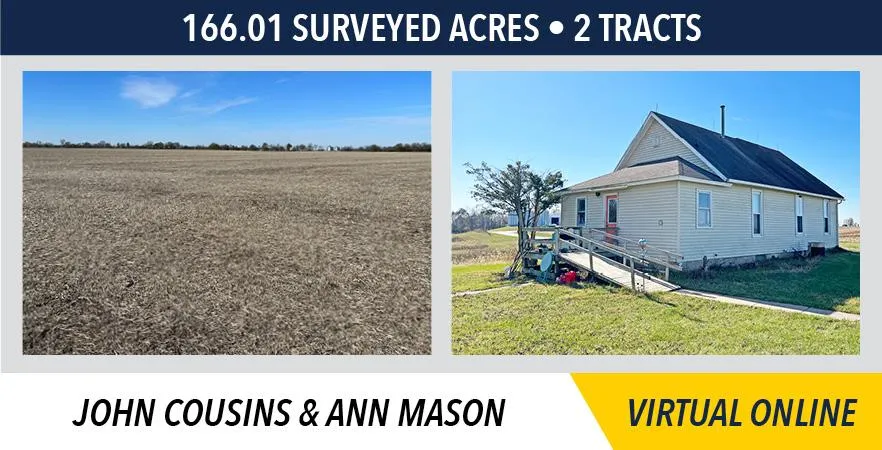 The Cousins & Mason farm will be sold on a price per acre basis, based on surveyed acres. Tract 1 will sell first, followed by Tract 2. The tracts will NOT be offered in their entirety at the conclusion of the auction.
