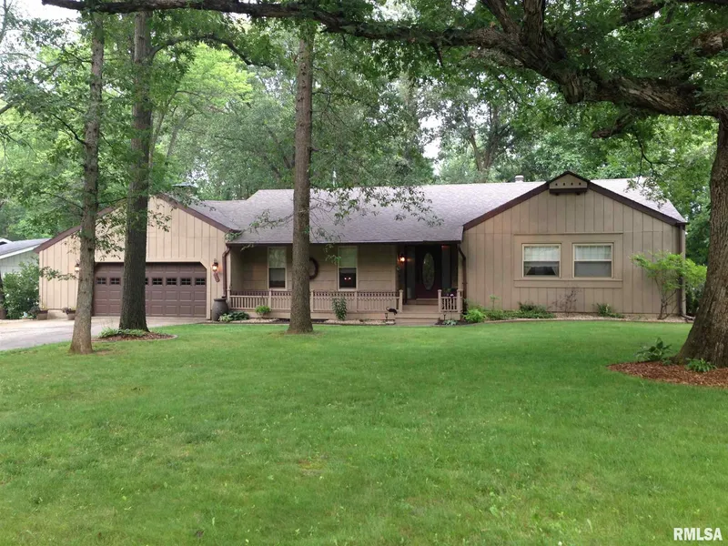 Beautiful setting This three bedroom, two bath Ranch home located on a corner lot features large Oaks. The home has an open floor plan, the large front foyer is inviting and will take you to a living room that is open to the dining and kitchen, the living room has a fireplace, the dining area has a built-in wet bar with lots of cabinetry and walkout to a large sunroom with lots of windows. The kitchen also offers lots of cabinetry, center island with cooktop and tile flooring. The main bedroom is large and has an on suite bath, two other bedrooms share a full bath, you will also find a den/home office, and large laundry room. All this on one level with no steps! This home also has an attached two car garage, partial basement that is unfinished, and private fenced patio area.