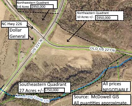 3. The Northwestern Quadrant contains about 3-6 acres, and it is ideal for a fast-food restaurant or tourist stop. It also has about 1300 feet of paved road frontage. 6200 vehicles per day. (NC...