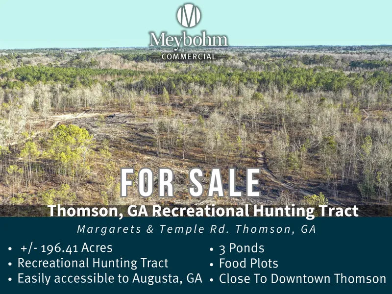 Meybohm Commercial Properties is proud to exclusively present this two parcel +/- 196.41 acre recreational hunting tract located in Thomson, GA the county seat of McDuffie County. Escape to the wilderness just 30 minutes from Augusta, GA and just minutes from revitalized downtown Thomson, GA! This tract offers the perfect blend of convenience and outdoor adventure. Property consists of several strategically designed food plots, 3 picturesque ponds with ducks located on the rear of the property, and a power line running through a portion of the property perfect for ample deer stand and hunting opportunities. Plenty of wildlife, perfect for deer, turkey, ducks, boar, and more. Explore the ultimate hunting paradise on this 196-acre tract. Embrace the thrill of the wild and create lasting memories in nature's playground. Your hunting retreat awaits!