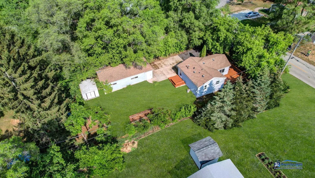 What a bright and cheery home! Just down the street from Wonder Lake and the private entrance to the association boat launch, pier and park! This home was updated this year with a brand new kitchen, new bathroom, and new light fixtures/ceiling fan. The new kitchen features soft close cabinets and drawers along with new stainless steel refrigerator and gas stove. Three solar tube skylights let natural light flow throughout the open concept kitchen and family room and will help keep your electric bill down. Large, freshly painted, wrap-around front deck that is large enough for entertaining with a small deck, concrete pad and bench seating out the back door. For the car lover or the mechanic or just for boat storage, you won't believe the oversized 2 car garage with work area, gas furnace for the winter and all the task lighting for whatever you would like to work on out there (with its own electric panel). Home has been primed and ready for your personal colors. Great neutral vinyl plank wood flooring throughout (2021). Newer windows on north and west side of home. Roof replaced within the last 10 years. Well pump just replaced too! What a place to call home at such a low price. The back yard is partially fenced in with an extra shed as well. Mature trees surround the oversized lot. Raised garden bed ready to start your own vegetable garden.