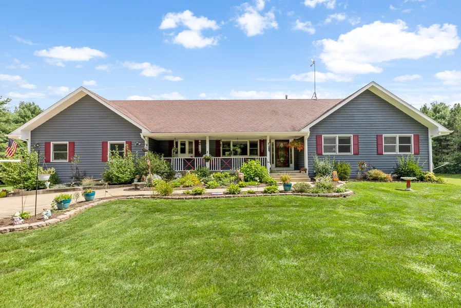 Experience this breathtaking custom ranch nestled on over 5 acres of beautiful countryside, zoned AG. This expansive residence boasts 3,600 square feet of open living space, featuring hardwood floors and a freshly painted main floor. The living room offers a stately fireplace and 12.5-foot vaulted ceilings, seamlessly connecting to the formal dining room, which is enhanced by a large picture window for abundant natural light. The kitchen is equipped with solid oak cabinets, white appliances, a breakfast bar, and an eat-in area with deck access. Down the hall, you'll find two generous guest bedrooms, a guest bathroom, and the primary suite, complete with vaulted ceilings, a walk-in closet, and an en suite bathroom featuring new tile flooring and toilet (2022), a double sink vanity, a Jacuzzi tub, and a shower. The finished lower level, updated with new carpet in 2022, is partially exposed and includes a massive recreation room with large picture windows, a pool table area, and a gas fireplace. This level also features a laundry room, another guest bathroom, and a fourth bedroom with a spacious walk-in closet. Additional highlights include an attached three-car garage with high ceilings, a concrete driveway, and extra parking space. Outside, enjoy a pristine lawn with extensive landscaping, an underground fence, room for an outbuilding, a fire pit, a garden shed, and unparalleled privacy provided by mature pine trees surrounding the property. Major updates include the exterior painted (2023), the new roof (2020), the water heater, water softener, and system (2024), garbage disposal (2022), washer and dryer (2017), and front porch railing (2022).