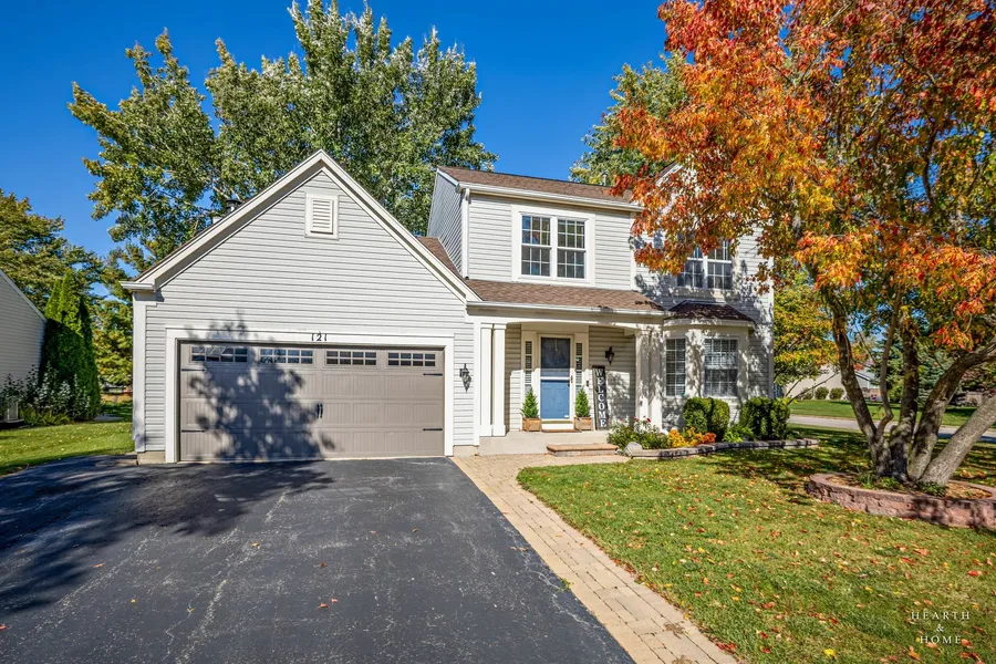 Absolutely Gorgeous and Move-In Ready home featuring 3 bedrooms, 2.5 bathrooms, and a beautifully updated 2-story residence! Welcome to your dream home - every detail has been lovingly cared for, creating a space that feels warm, inviting, and ready for new memories. Step inside to find a spacious living room that flows seamlessly into a formal dining area and a cozy family room highlighted by a stunning brick-accent wall - perfect for gatherings and entertaining. The bright and updated kitchen features a stylish backsplash, desk area, and a sunny breakfast nook with a large picture window overlooking the backyard. Hardwood and ceramic tile floors enhance the home's elegant main level. Upstairs, the primary suite is a true retreat with soaring ceilings, dual closets, and a private bath. Two additional bedrooms share a well-appointed hall bath, offering comfort and space for everyone. The partial basement provides great extra storage space. Outside, enjoy your own private oasis with a beautifully landscaped yard and brick paver patio, fire pit, and custom-built shed, all within a fully fenced yard. Recent updates include fresh paint and new carpet (Oct 2023), new sliding patio door (2021), new garage door and smart opener (2022), and new windows (2022-2023). The home also boasts a newer roof (2017), added brick accents, custom shed (2021), and a newer fence (2020). Perfectly located close to the historic Woodstock Square, schools, shops, and dining, this home blends timeless charm with modern upgrades for truly effortless living.