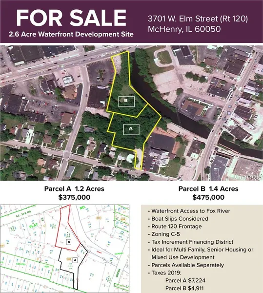 2.6 ACRE DEVELOPMENT SITE IN THE HEART OF MCHENRY WITH ACCESS ON NEWLY DREDGED BOONE CREEK TO THE FOX RIVER. ASSEMBLAGE OF 2 PARCELS FEATURING ROUGHLY 380' OF WATER FRONTAGE. PARCELS ARE ALSO AVAILABLE SEPARATELY. BOAT SLIPS POTENTIALLY AVAILABLE WITH ACCESS TO BOONE CREEK AND THE FOX RIVER. ASSEMBLAGE IS IN THE TIF DISTRICT AND HAS MULTIPLE ACCESS POINTS ON RT.120 AS WELL AS WAUKEGAN ROAD. IDEAL LOCATION FOR MULTI FAMILY, SENIOR/INDEPENDENT LIVING OR MIXED USE DEVELOPMENT.