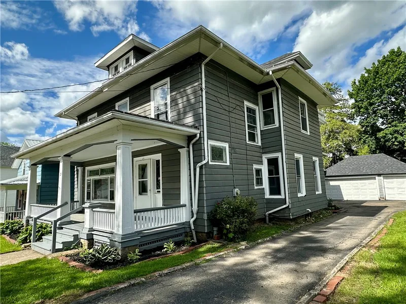 Enter this home from the large covered front porch and take in all the original woodwork and style. The foyer opens to the living room through sliding double wood doors and a full wall picture window. The oversized dining room has beautiful deco wood fireplace and wood beams in the ceiling. The den/bedroom off the dining room would make for a great office space or a 1st floor bedroom adjacent to the newly remodeled full bath. This new custom kitchen is perfect for this home. A large center island with Corian countertop and seating tops off the room that already has great cabinet space. There is an original built in wood cabinet that keeps the character of the home intact. The laundry room also provides a walk in pantry. The 2nd floor offers 5 bedrooms, an enclosed sunporch and deck. This floor offers the buyer a couple of choices on how to utilize the space. Newly remodeled full and half bath on this floor. Large full attic with stairway. A back stairway to the kitchen. A covered first floor deck, fenced yard and detached 22 X 26 garage. New roof, F/A heating system and more