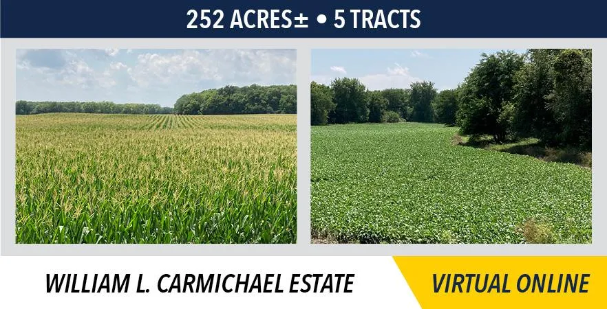 The William L. Carmichael Estate farm will be sold on a price per acre basis, based on surveyed acres. All 5 tracts will be offered through the marketing method of Buyers Choice, whereas the high bidder can elect any of the tracts for their high bid. If the high bidder does not elect all offered tracts, then the remaining tract(s) will continue to be offered Buyers Choice until all tracts have been elected. The tracts will NOT be offered in their entirety at the conclusion of the auction.