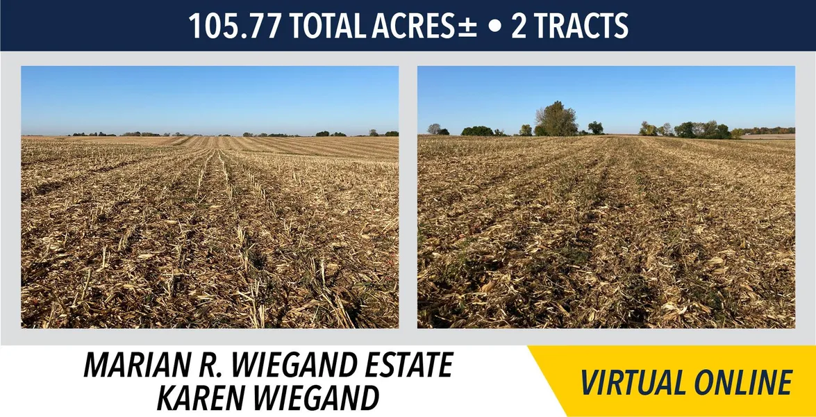 The Wiegand farms will be sold on a price per acre basis - Tract 1 will be sold based on surveyed acres and Tract 2 will be sold based on taxable acres. Both tracts will be offered through the marketing method of Buyers Choice, whereas the high bidder can elect any of the tracts for their high bid. If the high bidder does not elect all offered tracts, then the remaining tract(s) will continue to be offered Buyers Choice until all tracts have been elected. The tracts will NOT be offered in their entirety at the conclusion of the auction.