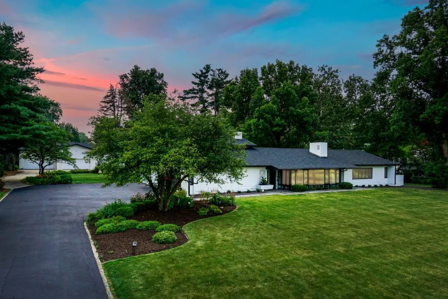 Nestled within the prestigious Bloomington Country Club neighborhood, this luxury ranch-style home sits on a double lot, offering a mid-century modern feel. As you approach the property, you'll be captivated by the serene and private setting, surrounded by matured trees and stunning views of the nearby golf course. Upon entering the home, a stone floor foyer with three storage coat closets welcomes you. The expansive, open floor plan seamlessly connects the main family room and dining area, featuring a striking marble wood-burning fireplace, built in shelves and new 3/4 solid birch wood floors that flow into all bedrooms. Style and functionality meet in the updated retro-style mid-century modern kitchen that is outfitted with stainless steel appliances, stainless steel workspace, professionally painted original St. Charles Mid Century Modern cabinets, pass-through, and large walk-in pantry. Adjacent to the kitchen, a practical drop zone with ample closet space and a separate service door into the house provides convenience and organization. For more relaxed living, the four seasons sun room offers expansive views of the peaceful, double lot yard, allowing you to enjoy the beauty of each season from the comfort of your home. This residence boasts four large bedrooms, each with generous closet space, and four full bathrooms. The fourth bedroom above the garage offers a full bathroom and double closets providing an additional versatile space, perfect for a guest suite or home office. The main floor half bath has been meticulously remodeled with high-end design choices, adding a touch of luxury. The lower level features an updated basement with new luxury engineered hardwood floors, fresh paint, new trim, new light fixtures, a built-in display shelf, full bathroom, and laundry room with sink & work space all creating a cozy and inviting space for additional living or recreational activities. For car enthusiasts or those in need of extra storage, the property includes an attached three-car garage with three large storage closets and utility sink. Additionally, there is a six-car detached, extra-deep, heated garage with a massive 60 x 40 bonus room on the second floor, offering endless potential for use. This exceptional garage setup is perfect for hobbies, a workshop, or additional living space. Outdoor living is equally impressive with a large patio with built-in seating, perfect for entertaining or simply enjoying the tranquility of the beautiful surroundings. The private backyard oasis provides a peaceful retreat, ideal for relaxation and outdoor activities. Both the house and the detached garage have new roofs installed in 2021. This one of a kind home in the Bloomington Country Club neighborhood is ready for your vision! Reach out today for a private tour and experience the beauty of this home for yourself.
