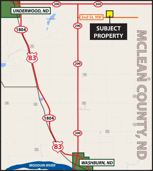 Driving Directions: From Washburn, ND: Drive 10 miles north on HWY #200, then 1 mile east on 2nd St. NE. to the property.