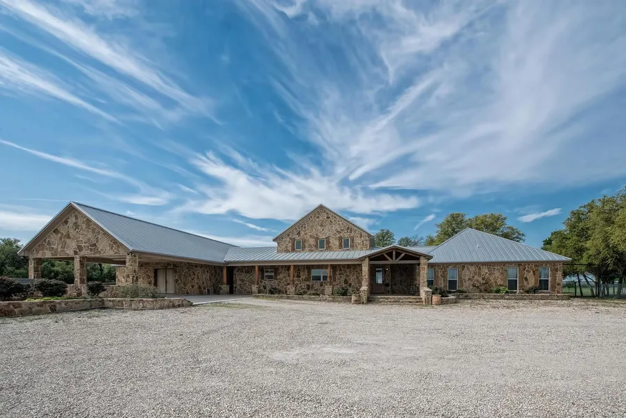 Massive rock home on 50 acres! This custom built home has rustic charm throughout including unique lighting, vaulted ceilings, game room, craft room, rock detailing, mud room, built-ins, copper farm sink, copper jacuzzi tub, and much more. The master suite includes two huge walk-in closets and 2 other closets. The exterior has an 1,800 sqft wrap around porch with a fireplace, mounted tv, and dining area. Also enjoy tons of oak trees surrounding the house and a beautiful view of the pond. More acereage available as well as a guest house.