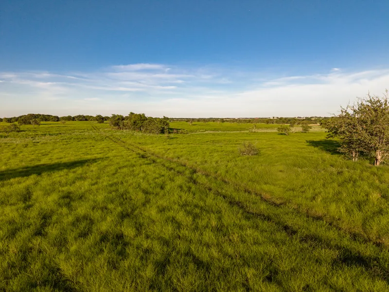 The land opens with a concrete entry drive off Rattler Hill and unfolds into gentle rises and rolling pastures. Elevation crests near the center of the tract, offering wide-open views and ideal build sites set back from the road. The front of the property is naturally screened by a mix of native oaks and mesquite, providing immediate privacy without the need for clearing.