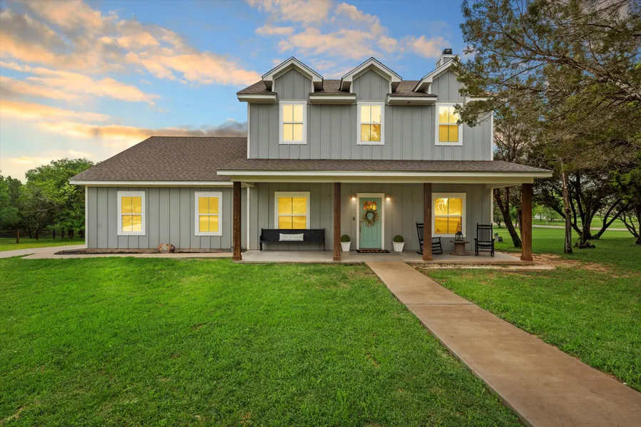 Beautiful farm style home on over an acre in the highly desirable Hills of Childress Creek. Two-story beauty with welcoming curb appeal featuring a large front patio and grand entryway. Open concept 5BR/3.5BA home is the perfect gathering place for friends and family. Lovely living/dining area with a wood burning fireplace, beautiful concrete floors, pretty cedar floating shelves and nice fixtures. Gourmet kitchen complete with a massive island, coffee bar, stainless steel appliances, granite counters, ample counter space, white farm sink, custom cabinets and an oversized pantry. Isolated downstairs primary suite with a luxury bathroom that includes separate sinks, walk-in tiled shower, soaking tub, great storage and separate his and her closets. Additional downstairs amenities include a half bath and a large laundry room featuring a sink, cabinets and adorable mud room area. Upstairs is where the house truly sets itself apart! The upstairs features 4 great sized bedrooms, 2 full bathrooms (one hall bath and one Jack and Jill setup), flex room that can be a play room/office/hobby space, and walk-in attic access. This attic access showcases how well the home is built plus gives you so much storage space and highlights the foam insulation, too! 1.07 acre, corner lot with many trees, extra driveway space and a large workshop. Workshop size is 22x35 (770 sq ft), has foam insulation and electrical with plenty of room on the panel to add other things. Zoned to China Spring ISD. This place is calling you home!