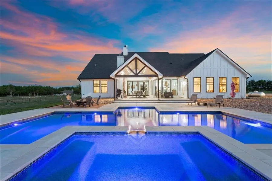 Welcome to 688 Pleasant Run Rd, a stunning 20+ acre retreat in picturesque Crawford, TX. This upscale residence features five generous bedrooms, four full baths, and two multifunctional office spaces. Expertly designed with an open floor plan, this home flawlessly melds indoors with outdoors. A well-equipped kitchen with a butlers pantry, formal dining area, and spacious family room easily opens up to an external haven through accordion-style glass doors, making entertainment effortless. Impeccable craftsmanship by W4 Custom Builders, high-end materials, and thoughtful architecture are hallmarks of this property. The outdoor space presents an incredible, air-conditioned 3,000 SQFT barn primed for any sports and entertainment lover. Complete with an indoor gym, batting area with retractable net, bar, full bath, and a versatile office or apartment loft; the barn becomes an extension of the home. It includes four horse stables, a paddock, and a dog run. A welcoming patio unfolds into a radiant pool area, perfectly integrated with a soothing spa and cascading waterfall feature. This elegant outdoor oasis beautifully merges with the serene backdrop of the Texas prairie landscape. The fully fenced property encompassing 20+ acres promises natural beauty with a 1/4 acre creek-fed pond, a horse arena, and a baseball practice field. Working pens and varied pasture areas punctuate this unique, sprawling ranch estate. This property's appeal is elevated by a short 25-minute drive to Downtown Waco and I-35 and its inclusion in the sought-after Crawford ISD. The builder/seller will invite the new owner's input on a fresh color palette for the home's interior. The house has been built with the possibility of adding a second story, which an interested buyer could pursue after the home has been sold.