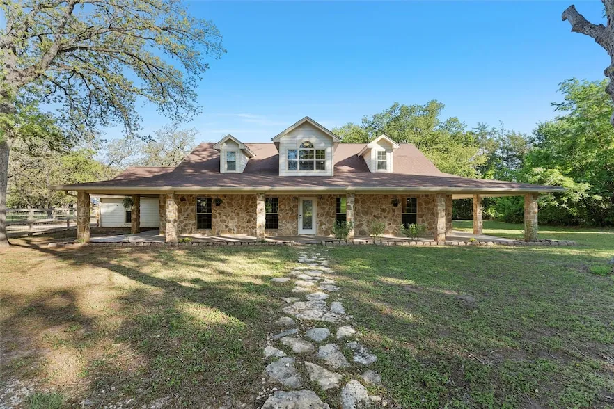 Peaceful, wooded retreat in a beautiful country setting, on an over 1 acre lot with 2 sides of privacy landscaping. This home is the perfect balance of community and seclusion. Set back with circle and side driveways, a dream shop is waiting around back ready to be filled with RV storage and hookups available, 2 roll up doors, paved and dirt parking areas, and even a fun sport pad. The residence greets guests with a dreamy wrap around porch for tons of outdoor enjoyment. Inside, a large stone fireplace anchors an open living, dining and kitchen area. The downstairs, primary suite features a primary bathroom with ample space and storage. Downstairs you'll also find a mud and laundry room big enough for all of our needs and 2 other bedrooms with a jack-and-jill, hall bathroom arrangement. Upstairs, the extremely large bonus room could easily be an oversized 4th bedroom, game room, or split to accommodate both with their own full bathroom available. Fresh paint, flooring, and new HVAC, all in Robinson ISD!
