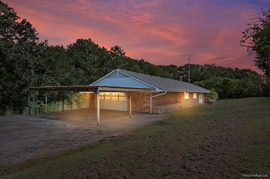 This type of property doesn't come along every day! Nice tree coverage offers peaceful surroundings around home and the same around the perimeter of the 24 acres. Stock tank currently has water and there is room to enlarge the area it covers. Large Ranch style home has floor to ceiling windows in the living room and provides beautiful views and the same in the isolated primary bedroom leads to a covered patio where you can enjoy morning coffee while preparing for your day. Huge stone, double sided fireplace provides warmth not only in the living area, but also in the primary bedroom. Ensuite provides separate dressing area from vanity, shower and jetted tub and nice sized closet offers options. Add your special touches to the kitchen to make it your own. Hallway from carport door to kitchen supplies storage, laundry room and more than spacious pantry. Dining room and secondary bedrooms have plantation shutters on windows that add a touch of beauty. Storage space in the home is nothing short of ample and enclosed garage could be anything from game room to office to any number of plans you might have. Old farmhouse and buildings on the pasture side of the property provide more possibilities, especially the previously used office-covered shed building which is plumbed and has electricity. Farmhouse and barn are most likely tear downs; however, with effort might could be reworked and used as living quarters and farm related shelter. Make an appointment today to see this one and let your imagination run wild!