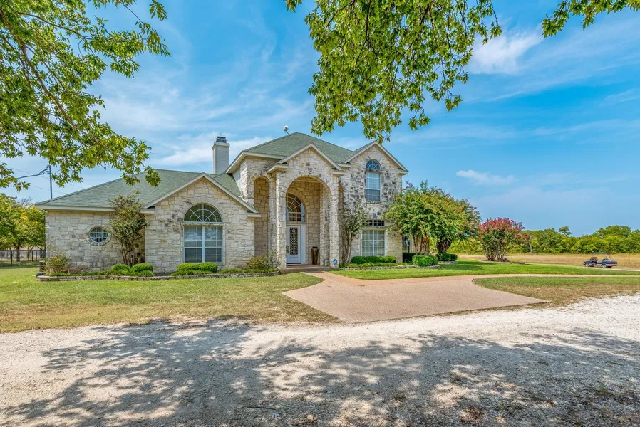 Elegant country living in this pretty Austin stone home on approx 9 acres. Lots of living space with a large formal living room and fireplace plus a great den off the kitchen. Light and bright with lots of windows. Awesome kitchen with island, good cabinet space and open to den. Formal dining room for entertaing. Great master suite with pretty tilework, big shower and garden tub. 3 bedrooms upstairs with balcony to enjoy the view. New pipe fencing and horse barn.