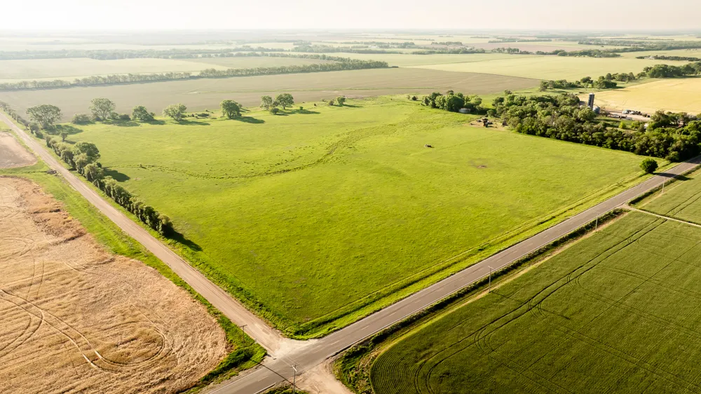 Located at the intersection of Plum Avenue and Eisenhower Road is 40 +/- acres of productive cropland. This fertile soil is comprised entirely of Class II Silt Loam, carrying an overall productivity score of 71. This means that this acreage is capable of producing significantly above average yields for the county. The land has been most recently used as pasture for a couple of horses and a bull, and for quality hay production. The mixture of tame and native grasses has been a big producer for years. There is well-built barbed wire fencing enclosing the tract, so it is ready for your herd. In the southern portion of the farm is a grove of trees and a good-sized dug pond. This provides ample water for livestock and wildlife in the area. Being situated on a blacktop, this land is easy to get to from any direction. Whether getting to-and-from to check cows, get seed in the ground, or haul hay, the convenience of this location is attractive.