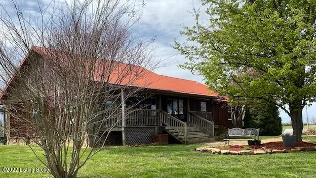 Get ready to live 'Lodge' in Meade County! This beautiful home boasts southern comfort just 10 minutes from Brandenburg. Enjoy the scenic view from the large front porch. Then step inside the breathtaking interior. The main living area has an expose beam and wood ceiling making it so warm and inviting. Tons of cabinet storage and a double wide peninsula make this a great kitchen for entertaining. The custom table and chairs for 10 remains. The hall and doorways are wide and wheelchair accessible. Bedrooms and hallway are sprinkler system protected. The bedrooms are spacious and the master bedroom hosts a walk in closet with pull down stairs to access the huge attic storage. Laundry is located in the master bath which has a shower and whirlpool tub.