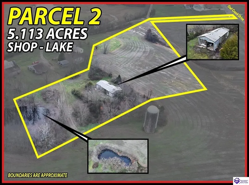 Going on the auction block, selling by online bidding only auction, is 5.113 acres with a shop building and pond that fronts Owl Creek Drive. The acreage is zoned R1, is mostly open, has county water available and is in a great location. Online bidding is scheduled to start to end on December 9th, 2025 at 4:00 PM EST.