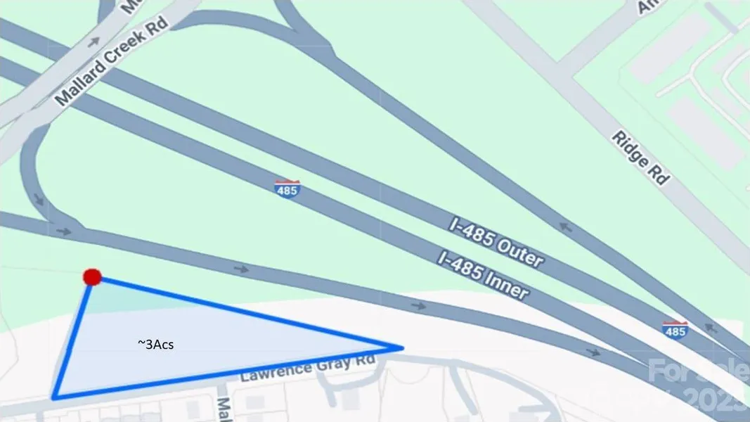 Excellent Development Opportunity at I-485 and Mallard Creek Rd interchange. ~3ac parcel already zoned for Multi-Family (N2-B). Good visibility to I-485 from site and easy access to I-485 via on-ramp at Mallard Creek Rd intersection. Conceptual Plan in attachments demonstrates the potential for 48 units in Two 3-story buildings w/64 parking spaces proposed (only 48 spaces required, however). Optional Amenity Area across drainage ditch. City water/sewer and other utilities available at street. Over 850' road frontage. Physical survey attached. Topographical survey available.
