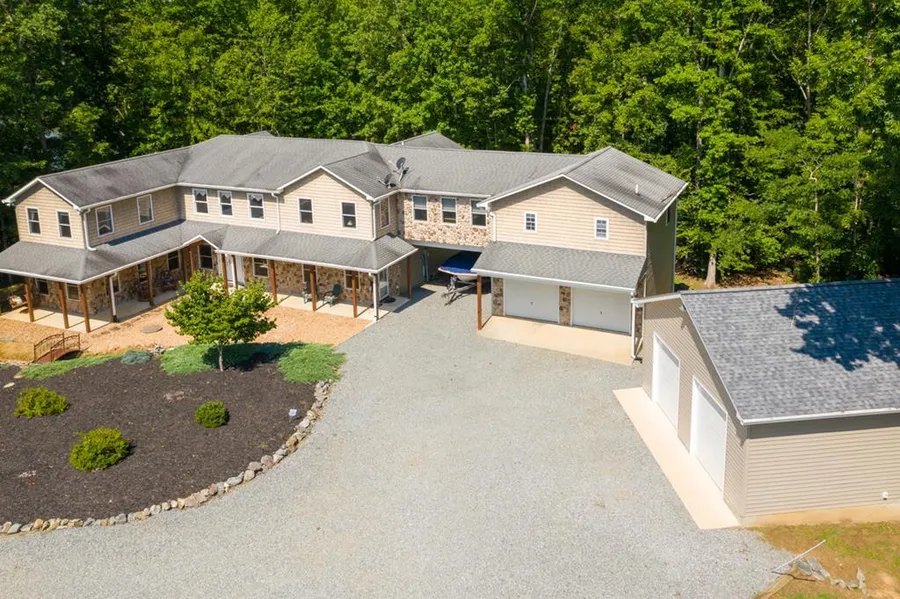 FIVE BEDROOM LAKE HOUSE with apartment in Bluestone area of Kerr Lake on 10.73 Waterfront Acres with 600 feet of Kerr Lake shoreline. Two story open floor plan Great Room adjoins Chefs Kitchen with Custom Cabinets.Large Dining Room has Built In Wine Rack & Serving Area, currently owners office. First Floor Master Wing with Large Walk In Closet and ensuite Master Bath. Private Waterfront Dock & Gorgeous Waterfront Views. 3 bedrooms Upstairs plus separate guest furnished Apartment. Four decks/porches overlooking the lake and dock. Home Theater complete with surround sound and six recliners. The adjoining recreation room has a pool table that conveys. Lots of storage / parking with open carport and attached two car garage and just built detached two car garage. Bring your lake toys and your boat or buy the owners boat, also available. Zoned Central Heat & Air and Zoned Hot Water, and whole ...