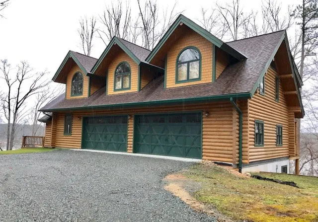 LOG HOME GUEST HOUSE FOR TODAY - BUILD YOUR MAIN HOUSE FOR TOMORROW. Polygon sunroom entrance and full bath and laundry on main level plus heated and cooled four car garage plus lake side deck. Upper level has 2 bedrooms and full bath plus full length upper deck off the great room. Full superior wall walk-out basement and patio with polygon wine cellar space under main entrance. 3.29 AC lake lot on deep water main channel of Bluestone Creek has a six bedroom perk, with room for future main house (owner had planned a 6000+ SQ FT log home). Adjoining Lot 10 also available (1.6 AC) for $175,000 and Lot 9 available (1.17 AC) for $165,000. Bundle for 6.06 Acres total. Dock included plus additional dock permit for Lots 9 and 10 to share.