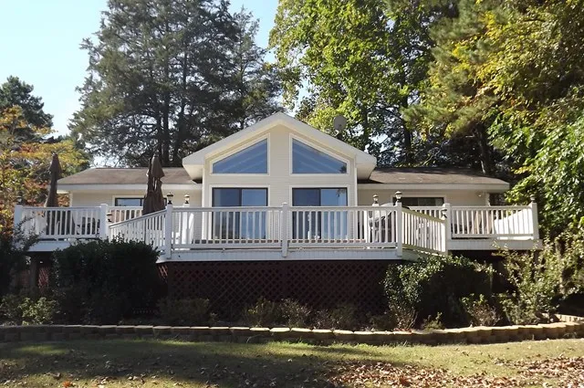 In The Premier Ponderosa Subdivision, Lake Home with extra lot and a 5 nautical mile Open Water View. This 2 bedroom plus 1 guest Room, 2 bath 1536 Sq.Ft. home boast maintenance free exteriors, hardwood floors, a open cathedral ceiling great room with lots of waterside windows and a grand stone fireplace, Water views from the living area and Master Bedroom are breath taking. Multi-level 900 Sq. Ft. waterside deck, waterfront gazebo and a dock in view of the house. Large detached two car/boat garage and extra paved parking areas. The Ponderosa is one of the few areas on Kerr Lake that the landowners own into the water ! (no trees) Endless possibilities and a must see if you want a new lake home.
