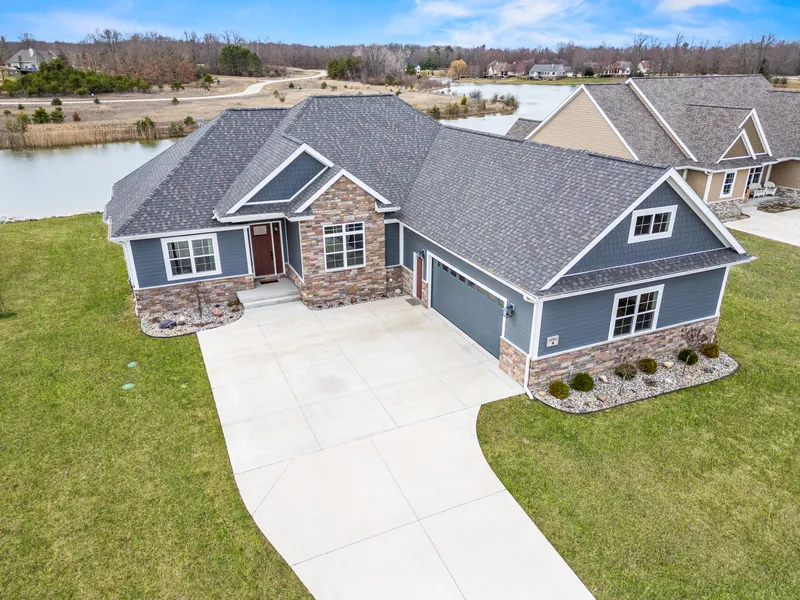 Step into refined luxury on the shores of Hamlet Lake in the heart of Tullymore, Stanwood's premier golf community. Built in 2022, this executive-style home offers 5 bedrooms, 3.5 baths, and a custom open floor plan thoughtfully designed for both everyday comfort and elegant entertaining. The gourmet kitchen showcases quartz countertops, high-end flooring, a classic white subway tile backsplash, and a decorative accent tile that highlights the open-shelving cabinetry. A separate pantry with a door provides additional storage just off the kitchen, and premium Samsung black stainless appliances bring modern flair and function. The living room is a true centerpiece, anchored by a split-stone fireplace and flanked by custom-built-ins, with large windows offering picturesque lake views. Adjacent, the den with French doors provides the perfect private space for a home office, formal dining room, or reading nook. The luxurious primary suite features a sunken stand-alone soaking tub for ultimate relaxation. Custom light fixtures, four-zone heating and cooling, and a practical mudroom off the back entry add to the home's comfort and style. Outdoor living is a dream with a 15x30 composite deck, a 15x30 concrete patio off the full walk-out basement, and a 14' diameter concrete firepit, all overlooking the tranquil waters of Hamlet Lake. The established yard, underground downspouts, and 18' double-width concrete driveway provide both beauty and durability. The attached 25'x32' 2.5 stall garage features an oversized 8x18 insulated door, and the exterior is finished with low-maintenance cement board siding, built to last and stand up to Michigan's seasons with style. The partially finished walk-out lower level includes a bedroom, full bathroom, and a spacious family room, plus ample storage space for all your needs. All located in the upscale Tullymore Golf Community, where championship golf, scenic trails, and resort-style amenities come standard. Luxury, lifestyle, and lakefront living. Welcome home to Tullymore!