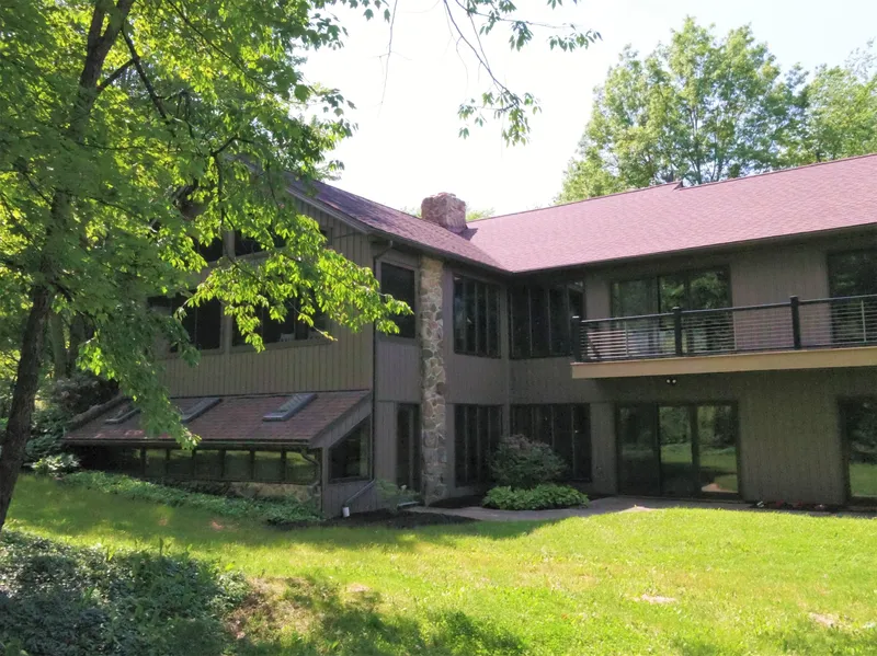 Unique, lightly contemporary executive retreat. This custom home is located on 16.73 wooded acres overlooking a 1+ acre lake. As well as a in-law site with 2557 square feet of finished living area. The main home consists of 5895 square feet of finished living space. The foyer flows into a massive, vaulted great room with stone fireplace, impressive window system and adjacent sunroom. The kitchen offers wooden, butcherblock counters and an island with gemstone, granite counter tops. The kitchen is open to a substantial dining area with a slider to a deck with fabulous views. The hallway leads to an office bedroom, full bath and eventually the master suite, featuring a glamour bath with a show and jet tub, a walk-in closet with cherry cabinets and sliders to a deck overlooking the lake. The lower level features a huge family room with a wood burner, wet bar and sunroom. A hallway leads to ...