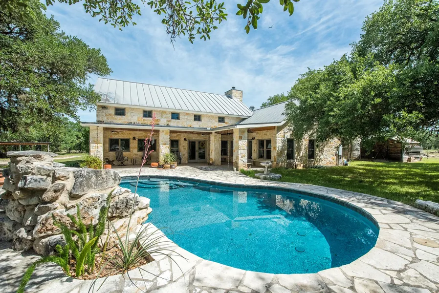 Improvements: A custom 2,614 sq. ft. white rock home with vaulted and beamed ceilings and a metal roof was constructed by the owner in 2005. The 2 bedroom, 2 bath home has identical master suites on each side of a very large living and dining area, along with an open kitchen. All living space and bedrooms are on the first level and a unique loft overlooks the living area and has a metal spiral staircase. A large rock patio and pool with fountain graces the side and back yard from a covered patio and porch.