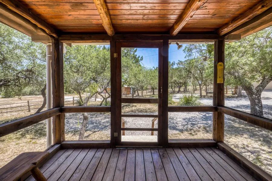 The two-bedroom/two-bath log-style home, with a detached garage and car port, is a study of warm wood and limestone. The stone fireplace invites people to gather on winter evenings as surely as the front and back porches beckon people to sit and sip coffee on lazy summer mornings. The metal-roofed house is serviced by a water well with a storage tank and includes a rain catchment system.