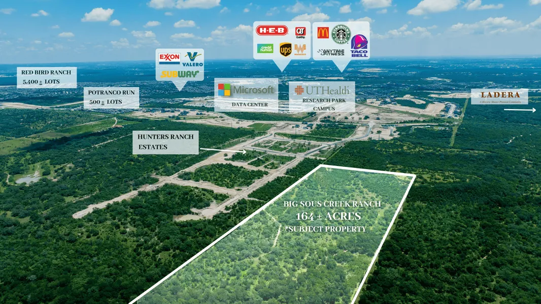 Situated in eastern Medina County, less than a mile from the Bexar County Line, the 164+/- acre Big Sous Creek Ranch offers great development potential and lies in an area experiencing tremendous growth and development. The Microsoft Data Center is located approximately .54 from the eastern boundary, UT Health Science Texas Research, CyrusOne and the recently proposed 123+/- acre CloudHQ data Center are within close proximity as well as HEB, QT, Whataburger and many other major retailers.