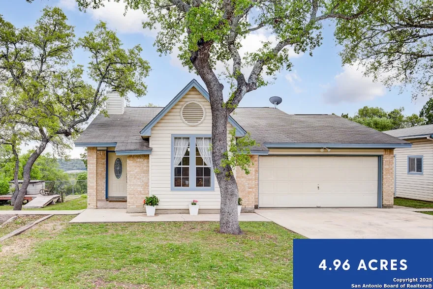 Welcome to this charming 3-bedroom, 2-bathroom home nestled on nearly 5 acres in the scenic Texas Hill Country. Built in 1988, this 1,199 sq ft home has been thoughtfully updated to blend rustic charm with modern comfort - just minutes from Medina Lake. Step inside to find fresh updates throughout, including new sheetrock and texture in all bedrooms, and tile flooring replaced in 2018. The bedrooms and bathrooms are rewired for added safety, the HVAC system was replaced in 2018, and a new roof was installed in 2015. The kitchen and living room are seamlessly connected, creating an open floor plan that's perfect for entertaining or enjoying easy flow throughout the house. The master suite is spacious and inviting, featuring a full bath that boasts a luxurious 7-foot walk-in shower. The guest bathroom has also been beautifully remodeled with modern finishes. Out front, a covered patio area provides the perfect space for gatherings, outdoor dining, or simply enjoying the peaceful surroundings. The home also features a private well that was drilled and installed in Feb 2024. In the backyard, you'll find a storage shed with a newly replaced roof (2025), as well as a detached one-car garage for additional parking or workspace. With plenty of room to roam and endless potential, this property offers the best of quiet country living with convenient access to the natural beauty of Medina Lake.