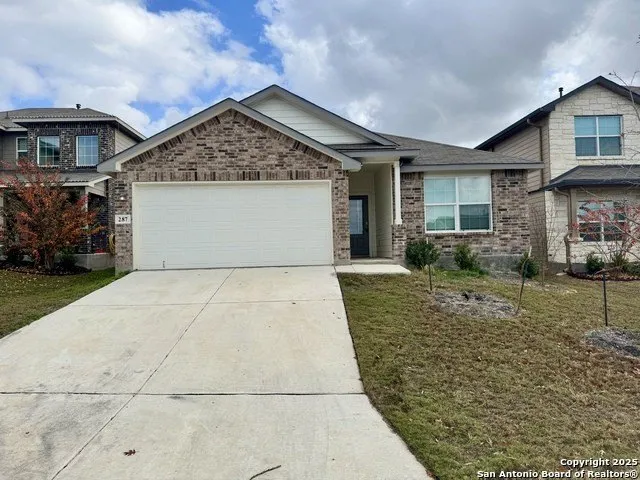 This well-maintained single-story home in Redbird Ranch offers a smart and functional layout with quality finishes throughout. With 3 bedrooms, 2 bathrooms, and a 2-car garage, the home provides flexible living space and comfort. Inside, you'll find luxury vinyl plank flooring and an open-concept design that flows from the dining area into the kitchen and living room. The kitchen features granite countertops, stainless steel appliances, a gas range, subway tile backsplash, and a large center island-ideal for both daily use and entertaining. The private primary suite includes a double vanity, separate tub and walk-in shower, enclosed water closet, and a spacious walk-in closet. Two secondary bedrooms and a full bath are located near the front of the home, along with a dedicated utility room. Additional features include 9-foot ceilings, ceramic tile in wet areas, pre-plumbing for a water softener, and a covered patio overlooking a fully landscaped yard with full irrigation. Community amenities and proximity to Lackland AFB add even more appeal.