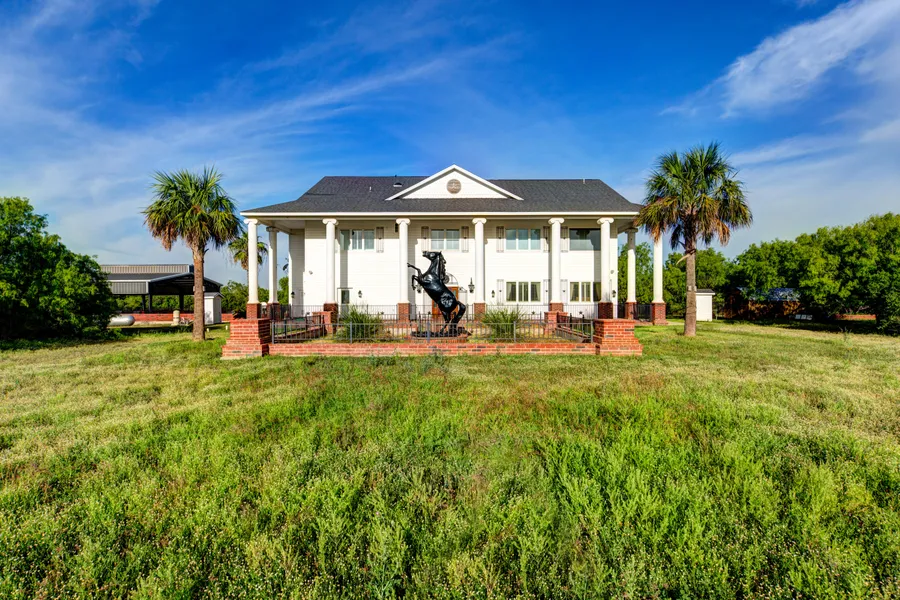 Stunning 7,600+/- SQFT, 8 Bedroom, 7 Bathroom home on 6 +/- Acres. Access from the county road has been paved giving a luxurious feel as you enter the property through the automatic gate. The home site is well appointed boasting an oversized saltwater swimming pool fully equipped with a 2,600 Sqft. +/- concrete deck and an 1,800 +/- SQFT. covered area perfect for entertaining large groups. No expense was spared in designing and building this entertainers dream home. From cherry wood ceilings, Swarovski crystal chandeliers, full commercial style kitchen, and full brick floors on the first floor to the doors and wall panels brought in from classic architecture in San Antonio and around South Texas, just to name a few, this home has all of the charm and character that you could ask for. The upper floors provide surreal countryside views from the porch and breathtaking sunsets from the game room. The property would make a gorgeous setting for weddings and large events, as well as a wonderful family home or hunting lodge. Additional acreage available.