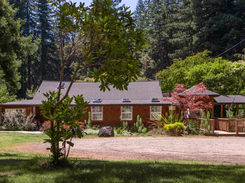 Seldom does such an exquisite and diverse property reach the market. Start with the remodeled 2000+ sq.ft., 2bd/2ba main home sitting in the sunbelt on five acres with large redwood trees, meadows, and special gardens. Wood floors, open-beamed ceilings, newer roof, copper gutters, and extensive redwood decking. There is also a charming one bedroom, one bath, 400 sq.ft. cabin and 1120 sq.ft. detached artist studio, barn, tree house, and woodshed. A smaller house, 2bd/1ba, 1200 sq.ft., is located on the second parcel next door in a sunny opening with a hand-dug well, septic system, and an additional workshop. Behind it are five incredible, detached bedrooms with sod roofs and artistic features throughout that have to be seen to be believed. There are 2 wells with an ozonated water system, water storage tanks, an automated irrigation system for the gardens, and a 15,000-watt generator for a...