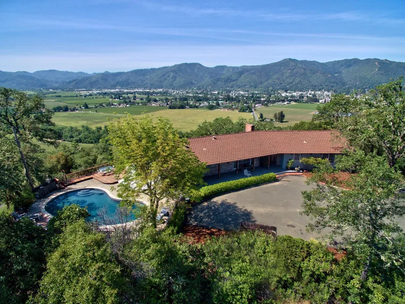 Rustic Luxe California Ranch Style home with some of the most dramatic views of the Ukiah Valley. Located on a 2.6 acre parcel, the residence is accessed by a private paved driveway leading up to the highest peak in Rogina Heights. The main home, just over 2000 square feet, features 3 bedrooms, 2.5 baths, a living room with a brick fireplace, formal dining area, family room with wood burning stove, beautiful chandelier's in many of the rooms, and soaring open beam bleached redwood ceilings throughout the house. The floor to ceiling glass doors open to the covered terrace and in-ground pool with spectacular valley views. There are separate guest quarters, detached from the main house, featuring a full kitchen, bath and expansive decks.