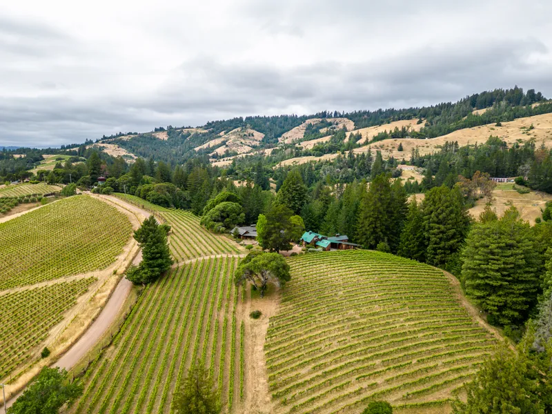 Nestled between lush forests & rolling Deep End vines, Romani Vineyards can be found. A complete wine country compound, this offering encompasses 21 acres of gentle land, with 5 acres planted to a combination of award winning Pinot Noir and Pinot Gris vines. Resting slightly above the valley floor, the improved area of the property captures incredible layered views of rolling vineyards and distant redwood forests. Two separate dwellings combine to create an ideal compound. The main residence includes a comfortable living area with open concept kitchen. Off the main living area, is a secondary living area warmed by a wood stove with sleeping loft above. A dining area, flooded with natural light and rich with views, connects the primary suite. An indoor pool allows for four season swimming and opens to an enchanting landscape, with pathways, bocce court and a redwood forest backdrop. Adjac...
