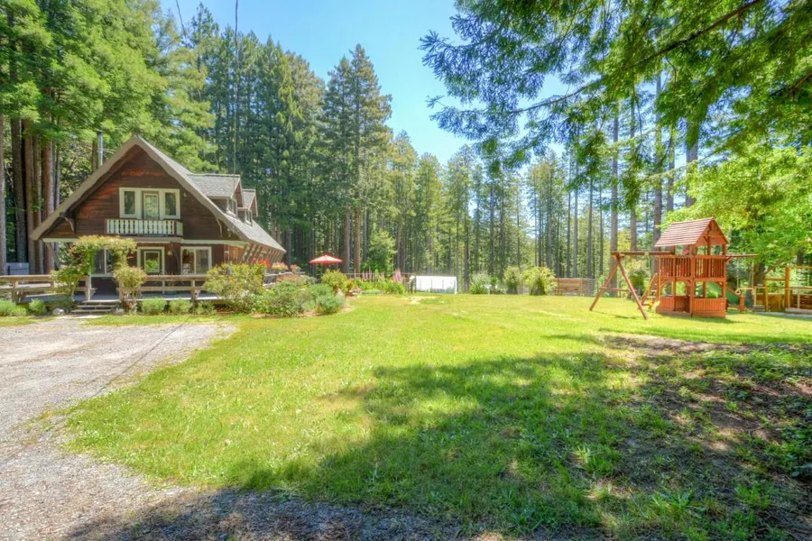 Remodeled Chalet style home in a gorgeous redwood forest setting. 3 bedrooms with carpet/2 bathrooms with tile showers and floors. Open family room with engineered hardwood flooring and kitchen with granite counters. Wrap around decking with hot tub gives views of flower gardens, large lawn, and enclosed veggie gardens. Detached sauna. Barn with laundry and room for storage/shop. Close to beaches, bluff trails and the amenities of town.