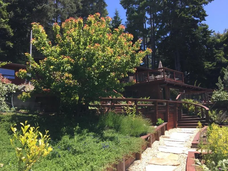 Mendocino ocean view home in the desirable original Surfwood Estates. No monthly HOA dues & vacation rental is OK. Attached lower level second unit for extra income or extended family. Owner financing & lease option is available! Like to garden & eat fresh food? Artichokes & Myers lemons currently growing, with several other raised beds for vegetables, flowers, & greenhouse. Solar panels feed back to grid, low PGE bill. Ample entertainment space w/expansive decks. Extra large 2-car garage w/work space. Full extension drawers in custom kitchen cabinets, big pantry, gas cook stove. Double oven. Lovely granite counter tops. 2-refrigerators, wine fridge, newer front-load washer & dryer. Skylights & large windows bring in lots of light. Gas fireplace, near 3-built-in bookshelves. Lots-o-storage. Additional features of the home and second unit includes: A 1-year home warranty, a total of 3.5 bathrooms with tile floors & fine cabinetry with granite counter tops. Hickory wood & bamboo floors; large laundry room with lots of storage & utility sink (laundry area includes garage entry and a half-bathroom.) Ceramic tile floor in both kitchens, one with decorative glass inlay. On the kitchen side of the main home is an exterior concrete patio with a gas outlet for a fire-pit or gas barbecue. Outbuildings include an under-deck shed/shop, a greenhouse, & two "tuff sheds" for additional exterior storage. A separate utilitarian driveway accesses the tuff sheds, fully-fenced backyard, & propane tank. A separate circle driveway has several paved parking spots at the home entryway & easy access in and out of the property. Lush landscaping with many flowering trees & bushes. Several large, raised beds, for vegetable gardening. Good sun exposure, wind protected, & a nice mix of open space & majestic trees. The patio & multi-level decks are perfect for parties, outdoor entertaining, & sitting outside to enjoy the gardens & ocean view.