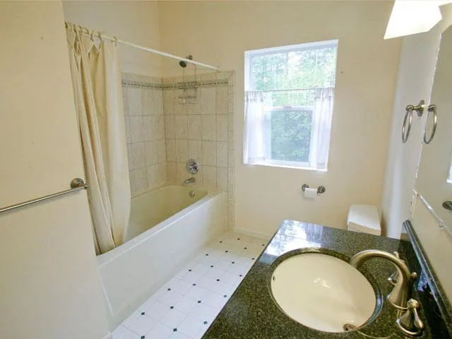 The Mother-In-Law unit features cathedral ceilings, large windows with lovely views and open, light filled rooms. The light filled bathroom features a wonderful soaking tub! A private deck is accessed through french doors from the living room. The kitchen is open to the living room compact, with good work space through a counter/bar.
