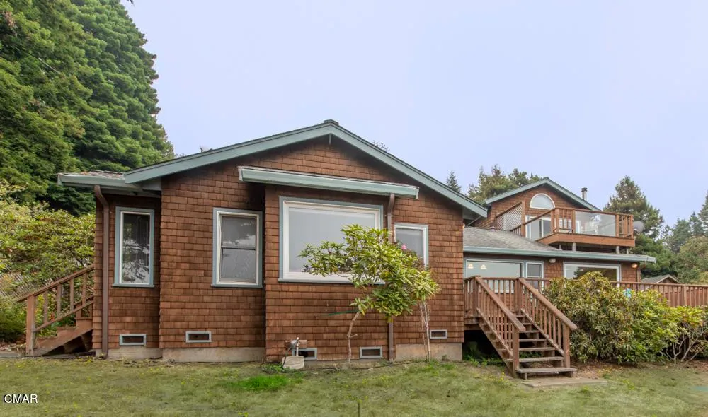 Charming house favorably sited on a knoll for lovely sunsets and distant ocean views. House features grand stone fireplace, vaulted ceilings, comfortable office and skylights. Primary bedroom suite has walk-in cedar lined closet, soaking tub and deck to relax and take in the views. The 520 sq. ft. studio with bath avails opportunities to update and personalize to your taste. Gardeners will enjoy the 26 assorted rhododendrons,, apple, pear and plum trees along with the fenced raised beds. There's even a 2600 gallon water storage tank with ozone system and an older barn. Offers will be reviewed on 2/14.