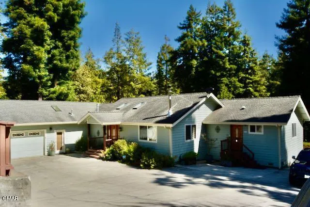 This immaculate 2 bed, 2 1/2 bath home, sited on 2 lovely acres is a must see! Set off the road for privacy, fronted by cleared space with ample room for your gardening pleasure, animals, or? Surrounded by mature landscaping with many special features, including a sweet waterfall, stately redwoods, ample decking, a lap pool, slate tile pathways, a chicken coop any chicken would be proud to live in, AND a fabulous Cabana, complete with a fireplace and kitchen! The house displays beautiful Russian Birch flooring & quality carpeting. Kitchen with beautiful cabinetry and island, dual fuel range, trash compactor, family dining room with a built in desk. Formal Dining Room in the Living Room area. Skylights and many windows bring in plenty of light. Primary bed with french doors