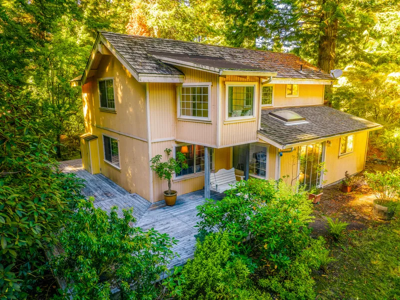 As you wind your way through the majestic Redwoods and pass through the stone and wrought iron gates of La Petite Maison, you are welcomed into a sunny, provincial country retreat. 4+ acres of secluded, landscape with two charming residences, a two-car garage (864+- sq.ft.) with a bonus 2nd story and exquisite gardens. Each home features its own private courtyard entry. The larger of the two homes (1,604+- sq.ft.) has 2 bedrooms and 2 baths. The first floor has an open floorplan containing the kitchen, living and dining areas that are accented with large picture windows and old-growth wooden beam ceilings. Upstairs, bright and airy bedrooms, a bath and window nook complete this cozy residence. The second home (947+- sq.ft.) is a 1-bedroom cottage that charms with rustic elegance and abundant natural light. The true joy of this listing are the gardens filled with rustling trees, the chirping of birds and sunlight pouring in from all angles. For those wanting a truly special place to make lifetime of memories, you have found your forever home. Redwoods, green meadows, quietude, and well-burnished homes await you.