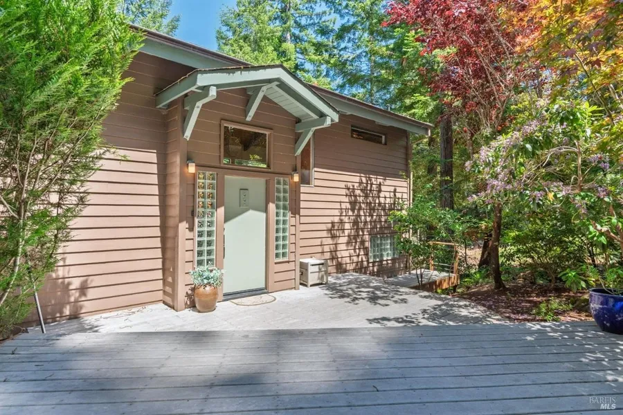 Tranquility Meets Creativity Among the Redwoods! Tucked away in a serene, forested setting surrounded by majestic redwoods, this custom-designed home offers the perfect balance of comfort, versatility, & natural beauty. Featuring a flexible layout with a two-bedroom second unit and a separate art studio or game room, the home is ideal for multi-generational living, hosting guests, or pursuing creative passions. Step inside to discover soaring ceilings and full-view windows that flood the living room with natural light and bring the outdoors in. Thoughtful built-ins add charm and function throughout the home. The expansive deck off the main level is perfect for grilling, entertaining, or simply soaking in the peaceful surrounding. Downstairs, you'll find an oversized primary suite complete with a walk-in closet and a luxurious bathroom featuring a soaking tub and walk-in shower. A second bedroom with a private entrance and shared access to the lower-level deck completes the lower floor. The beautifully landscaped grounds include mature Japanese maples & Rhododendrons and garden areas. Whether you're seeking a peaceful retreat, or a home with income potential this property invites you to experience life among the redwoods in style & comfort.