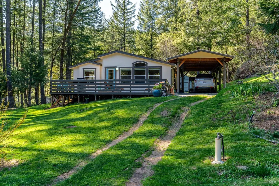 This land was homesteaded by the owner's family over 100 years ago during the early days of settlement. Since then, much of the land was subdivided with these parcels being the last remaining in the family. This property is the perfect blend of sophistication, privacy and natural beauty, featuring an exceptional 1824 sq ft home, nestled amongst majestic redwoods and Douglas firs. Designed for those who appreciate the great outdoors, this home sits on over 47 acres of lush land, split into two legal parcels and features two year-round creeks, an orchard, multiple sheds, a private well, a reliable year-round spring and PG&E, which is seldom found in this area. The open-concept interior is bright and inviting, with soaring ceilings, large windows framing forest views, and a cozy wood-burning fireplace. The spacious living and dining areas flow seamlessly into a fully equipped kitchen with modern appliances and generous counter space. The primary bedroom is large and light-filled, complete with a walk-in closet, and offers flexible space that can easily be reconfigured into two separate bedrooms if desired. Step outside onto the expansive deck and take in the peaceful sights and sounds. Whether you are looking for a turn-key primary residence in the woods or a get-away, this is it.